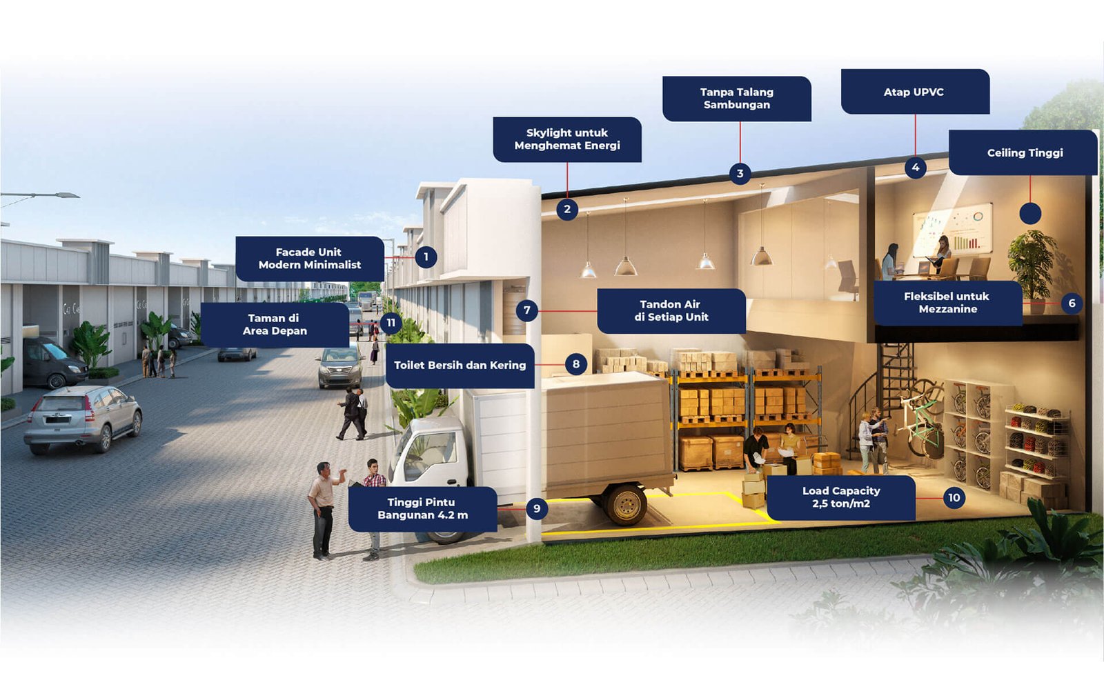 Dalam satu gedung sudah menyediakan paket WOW yang terdiri dari Warehouse, Office dan Workshop. Keuntungannya, itu bisa memudahkan quality control setiap usaha dan memaksimalkan hasil kerja.